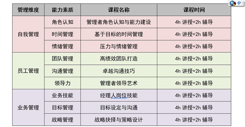 2、課程設(shè)置中高層管理者培訓(xùn)集中在“自我管理”、“員工管理”、“業(yè)務(wù)管理”三個(gè)維度,每個(gè)管理維度都有相對(duì)應(yīng)的能力素質(zhì)模塊,據(jù)此設(shè)置針對(duì)性課程,具體見表1-3。