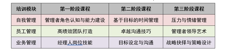 本培訓(xùn)方案的課程設(shè)計(jì)分三個(gè)模塊,每個(gè)模塊又分為三個(gè)階段,進(jìn)行進(jìn)階培訓(xùn)。課程安排可根據(jù)公司具體情況進(jìn)行個(gè)性化調(diào)整,既可以三個(gè)模塊同步進(jìn)行,也可以分模塊進(jìn)階。每門課程時(shí)間為1天,其中《卓越溝通技巧》和《管理者領(lǐng)導(dǎo)藝術(shù)》課程可以根據(jù)公司需要調(diào)整為兩天;《高績(jī)效團(tuán)隊(duì)打造》課程可以根據(jù)公司需要單獨(dú)設(shè)計(jì)績(jī)效相關(guān)課程,分開講授;預(yù)計(jì)培訓(xùn)總時(shí)間為9-12天。大致的課程安排見表1-4。